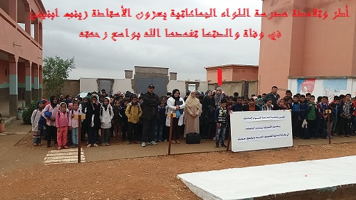 وفي نفس السياق،وبهدف إكساب التلاميذ والتلميذات قيمة المواساة أثناء المصائب التي لاراد لها ، نظمت مدرسة اللواء الجماعاتيةحفل تأبين الفقيدة يوم السبت 23 نونبر 2019 حيث تم الاستماع إلى آيات بينات من الذكر الحكيم وأيضا تقديم كلمات تعزية للتلاميذ والأساتذة أجمعت كلتاهما على تقاسم مشاعر الحزن والدعوة للفقيدة بالرحمة والغفران ولأهلها بالصبر والاستغفار. إنا لله وإنا إليه راجعون.